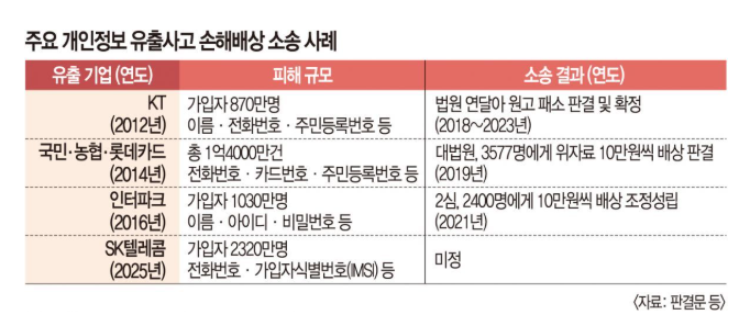 SK텔레콤, KT, 롯데카드 많은 사람들이 이용하는 서비스에서 개인정보 유출 사고가 연이어 발생하며 '금전배상'을 받기 위한 손해배상 소송에 관심이 쏠리고 있다.