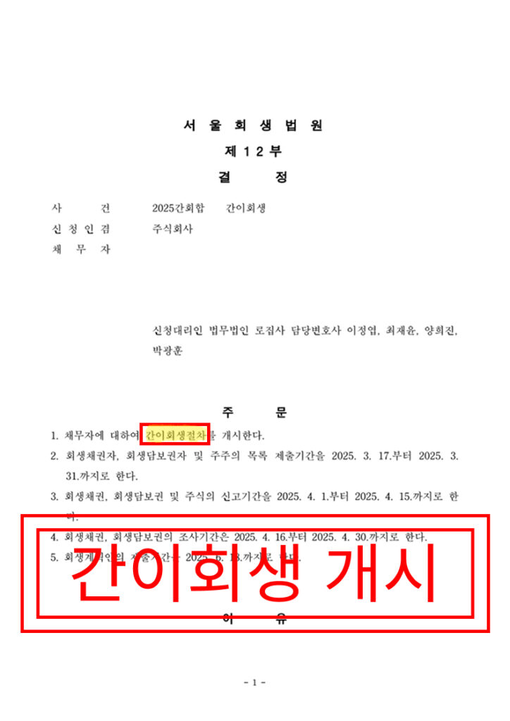 업무사례 법인회생(간이회생) 소프트웨어 개발 및 공급업 ‘H’ 법인 회생 사례 2025-08-28 Print Example Copy Link Example 공유링크 복사 사건 개요 ‘H’ 기업은 소프트웨어 개발 및 공급업을 주된 사업으로 영위해 온 회사입니다.그러나 정부 사업의 중도 탈락으로 인해 이미 투입된 인건비를 정산받지 못하였고, 지급받은 선급금에 대해서는 보증보험회사로부터 구상권 행사를 당하게 되었습니다.이러한 상황으로 인해 심각한 유동성 악화와 신용도 하락이 발생하였으며, 매출이 급감하고 신규 대출도 불가능한 위기 상황에 직면하게 되었습니다. 사건 결과 법원은 H 기업이 재정적으로 어려움에 처했으나 여전히 영업을 지속하고 있는 점을 고려하여, 기업의 존속 가치와 회생 가능성이 충분하다고 판단하였습니다.이에 따라 2025년 3월 17일, 법원은 H 기업에 대하여 간이회생절차 개시 결정을 내렸습니다. 절차 2025 .2. 20. 신청서, 보전처분신청서, 포괄적금지명령신청서 접수2025. 2. 21. 보전처분 결정 / 포괄적 금지명령2025. 3. 10. 대표자 심문기일2025. 3. 17. 개시결정 ← 목록으로