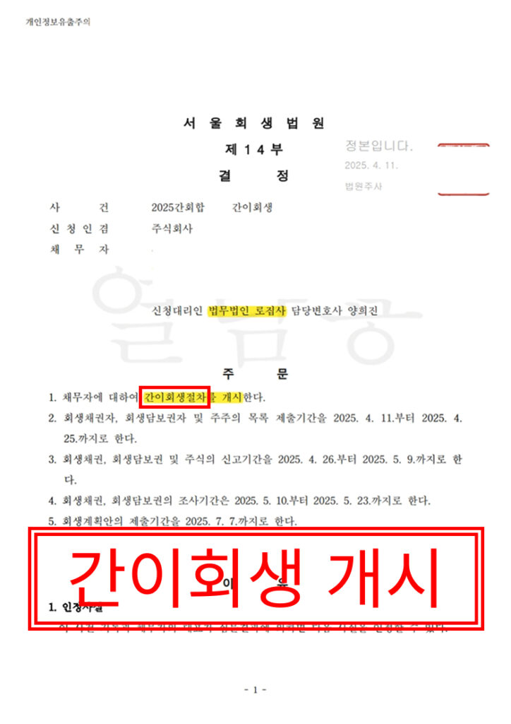 업무사례 법인회생(간이회생) 의료기기·생활건강용품 ‘O’기업 회생 사례 2025-08-28 Print Example Copy Link Example 공유링크 복사 사건 개요 채무자 ‘O’기업은 의료기기 및 생활 건강용품의 도·소매업을 주된 사업으로 영위해 온 회사입니다.회사는 신사업 확장을 시도하였으나 시장 개척에 실패하였고, 거래처였던 주식회사 티몬과 위메프의 회생절차 개시 신청으로 인해 해당 회사들로부터 정산금을 지급받지 못하게 되었습니다.이로 인해 매출이 감소하고 경영 실적도 악화되면서 심각한 재정적 어려움에 직면하게 되었습니다. 사건 결과 법원은 채무자의 재정 상태를 검토한 결과, 변제기에 있는 채무를 정상적으로 이행하기 어려운 상황임에도 기업의 존속 가능성은 충분하다고 보아, 간이회생절차 개시 요건을 충족한다고 판단하였습니다.이에 따라 2025년 4월 11일, 서울회생법원은 ‘O’기업에 대하여 간이회생절차 개시 결정을 내렸습니다 절차 2025. 3. 28. 신청서 접수, 보전처분신청서 및 포괄적금지명령 신청서 제출2025. 4. 1. 보전처분결정 / 포괄적금지명령2025. 4. 7. 대표자심문기일2025. 4. 11. 회생절차개시결정 ← 목록으로