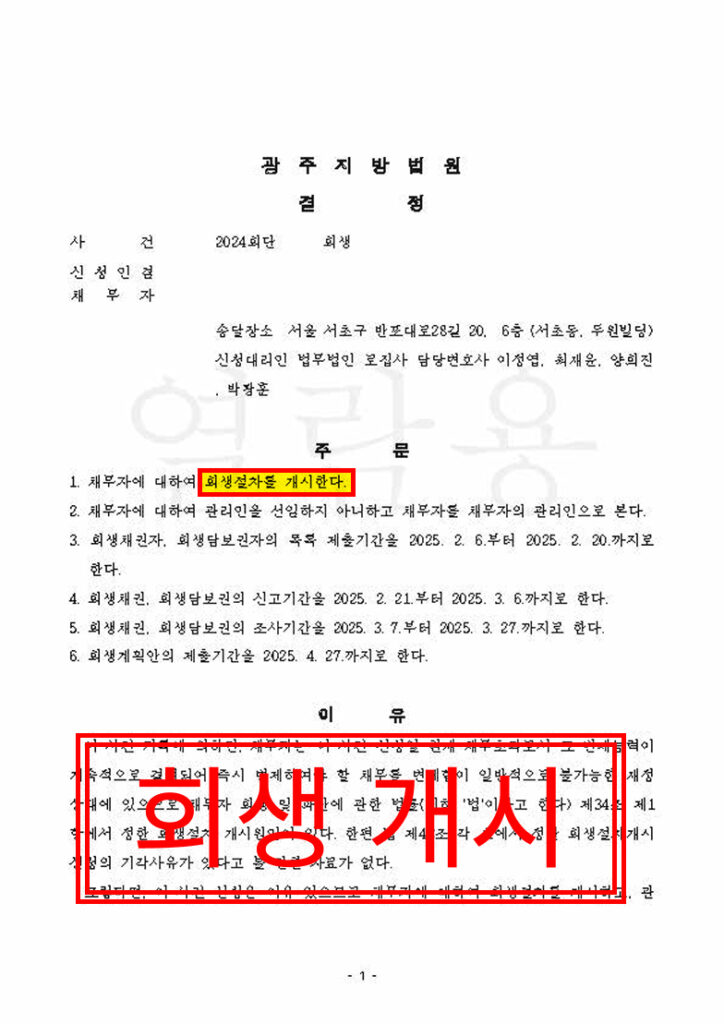 업무사례 일반회생 개인 ‘E’님 (대표이사 연대보증) 2025-08-29 Print Example Copy Link Example 공유링크 복사 사건 개요 채무자 L님은 한 회사의 대표이사로 재직 중이었으며, 해당 회사가 재정적 어려움으로 회생절차에 들어가면서 연대보증인으로서의 채무 부담을 지게 되었습니다. 회사의 유동성 위기로 인해 채무를 상환하지 못하게 되었고, 결국 본인도 회생 신청을 하게 되었습니다. 사건 결과 광주지방법원은 채무자가 신청일 현재 채무초과 상태에 있으며 변제 능력이 결여되어 즉시 변제하여야 할 채무를 이행하는 것이 일반적으로 불가능한 재정 상태라고 판단하였습니다. 또한 회생절차 개시 신청을 기각할 사유도 존재하지 않는다고 보았습니다. 이에 따라 법원은 2025년 2월 6일, L님에 대하여 회생절차 개시 결정을 내리고 채무자를 관리인으로 선임하였습니다. 본 사건은 대표이사의 연대보증 채무로 인해 개인까지 회생절차에 돌입한 사례로, 기업 회생과 동시에 대표자 개인 회생이 병행될 수 있음을 보여주는 사례입니다. 절차 2024. 11. 27 신청서 접수, 보정처분신청서 및 포괄적금지명령 신청서 제출 2024. 12. 27. 보전처분결정 및 포괄적 금지명령 2025. 2. 6. 회생절차 개시결정 ← 목록으로